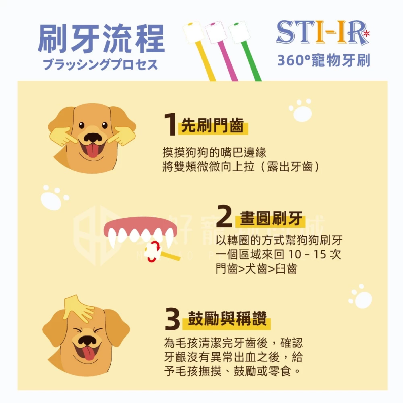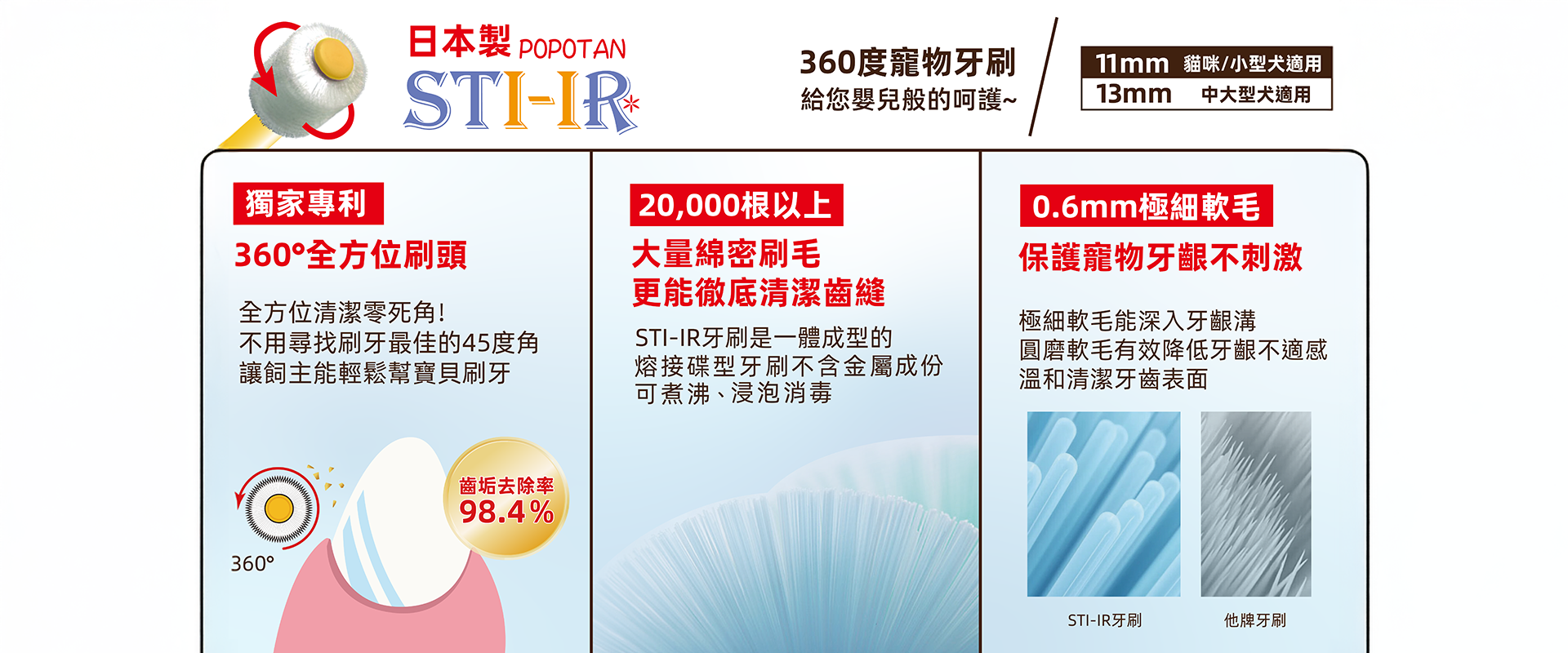 360度寵物牙刷 本公司代理日本製POPOTAN 360度寵物牙刷,獨家專利360°全方位刷頭,具有20,000根以上綿密刷毛,給您的毛小孩如嬰兒般呵護。 ✅ 讓飼主輕鬆幫毛小孩刷牙 ✅ 不含金屬、可煮沸、浸泡消毒 ✅ 細毛柔軟溫和、有效清潔牙齒